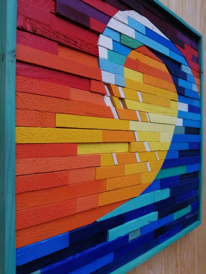 Handcrafted modern wood wall art piece that is made out of reclaimed and up cycled wood. To achieve this sculpture each piece of wood had to be individually ripped, cut, sanded, painted and assembled. This piece would be the focal point of any space whether it be home or office.