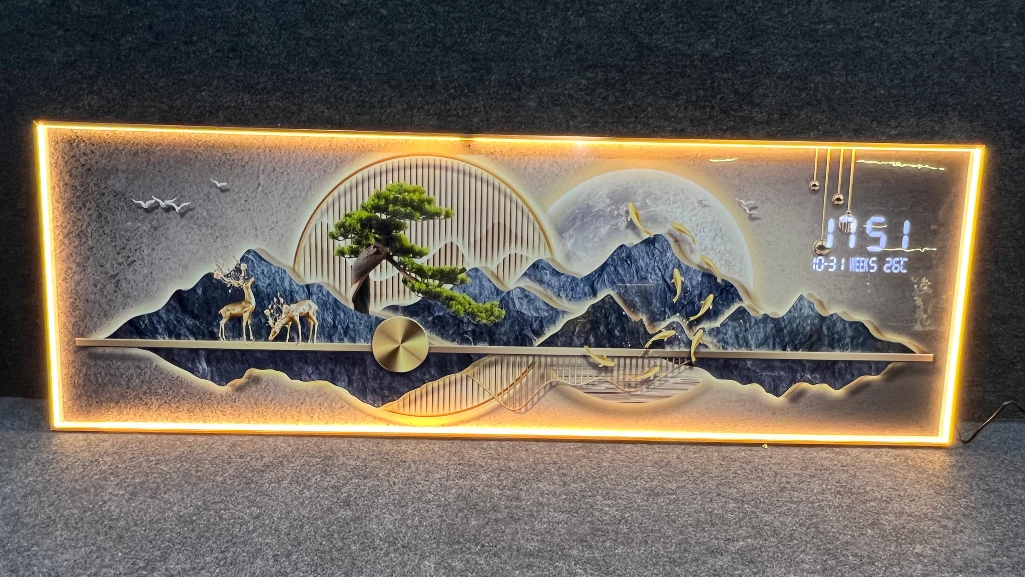 Elevate your living space with this exquisite crystal wall art that seamlessly blends artistic elegance with modern technology. This captivating piece features a serene mountain landscape, accompanied by a digital display that includes a clock, temperature, and week, ensuring you stay informed effortlessly.
